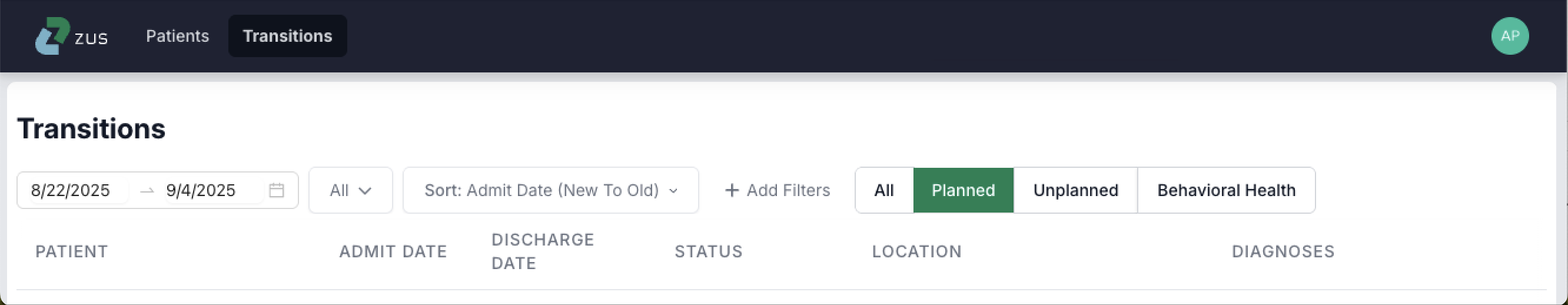 Starting today, the Transitions page of the Zus App includes additional filtering options and data taking advantage of recent updates to the Transition of Care (TOC) Lens.