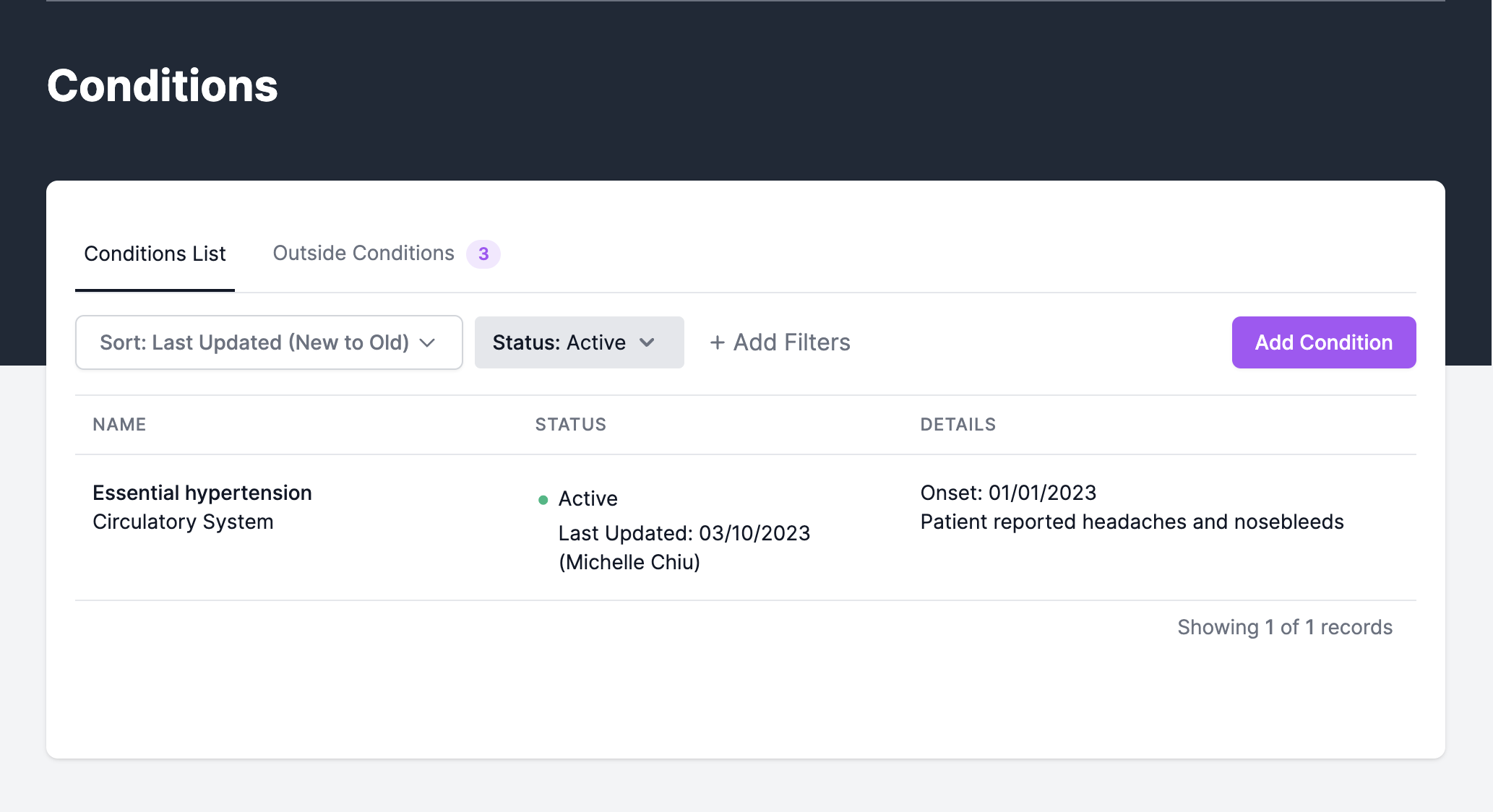The Conditions component allows providers to easily manage patient problem lists leveraging a summarized history of conditions reported for that patient. Providers can: