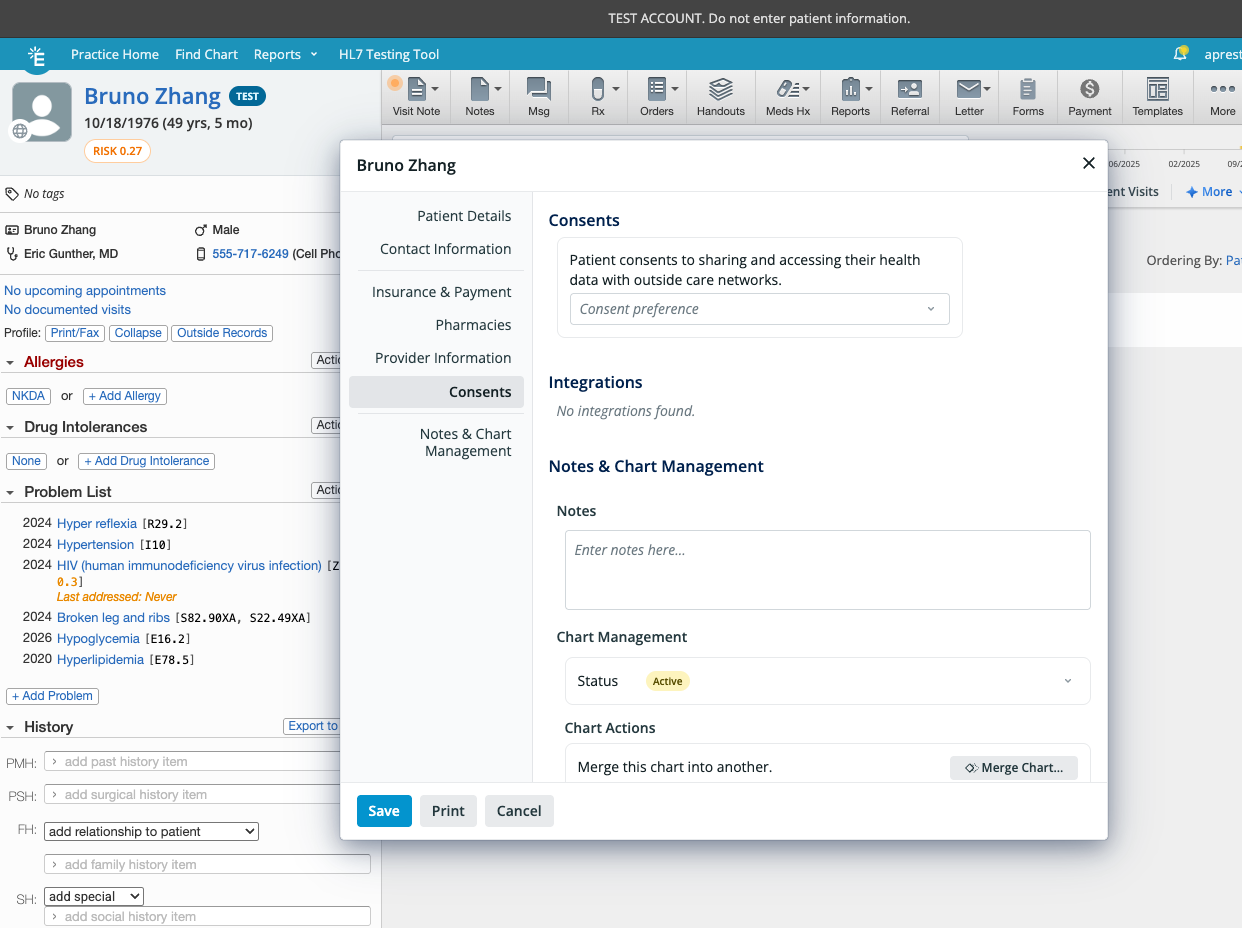 The "Consents" field in the patient information becomes available after the Zus < > Elation integration is enabled.