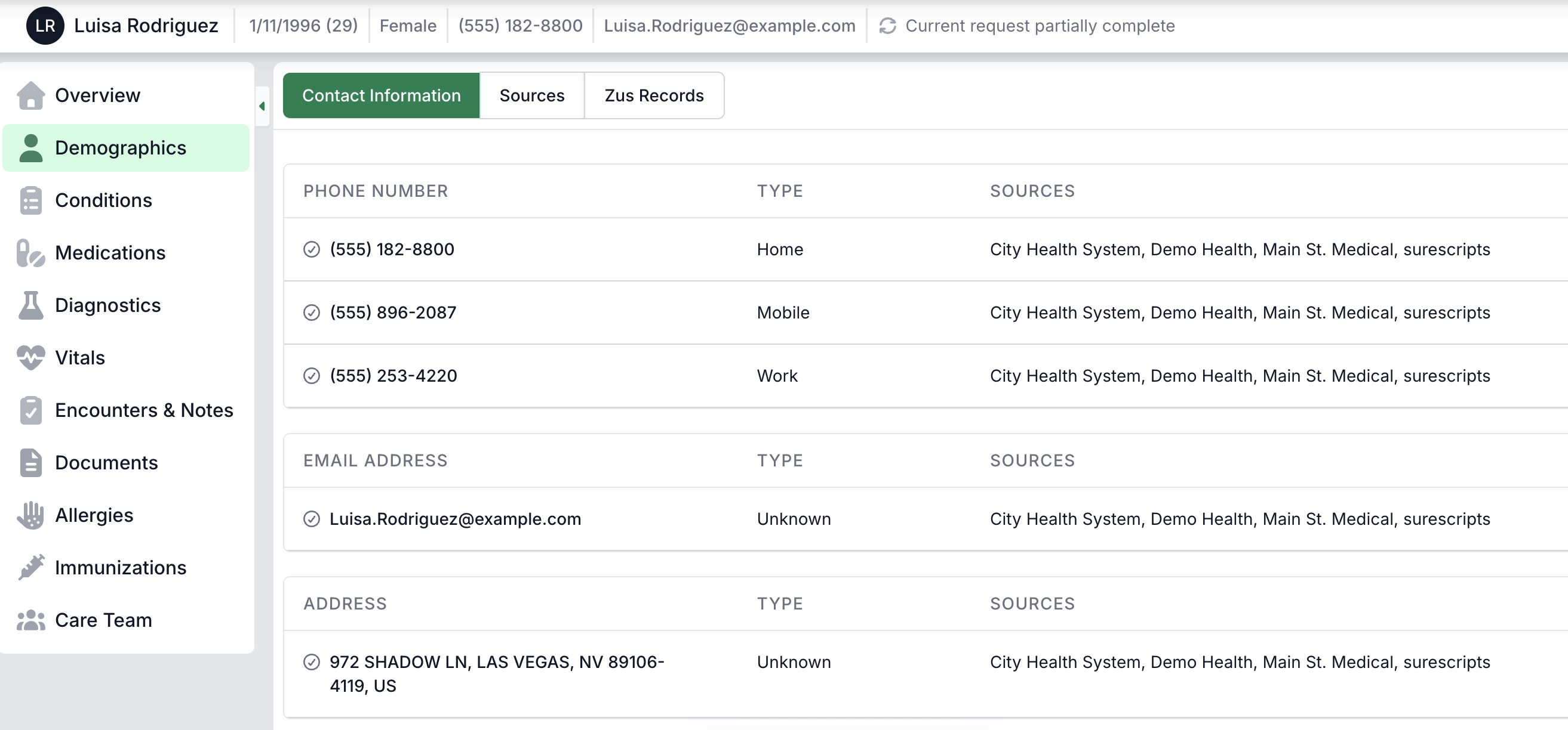 Overmerges that fail programmatic review are often clear when reviewed by a human. We list some common patterns to look for below. ZAP UI users can compare demographics across sources side-by-side in our Demographics component.