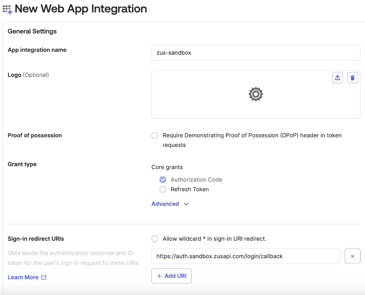 - Create a name for the app (e.g. “zus-sandbox”), and set the Sign-In Redirect URI as follows: