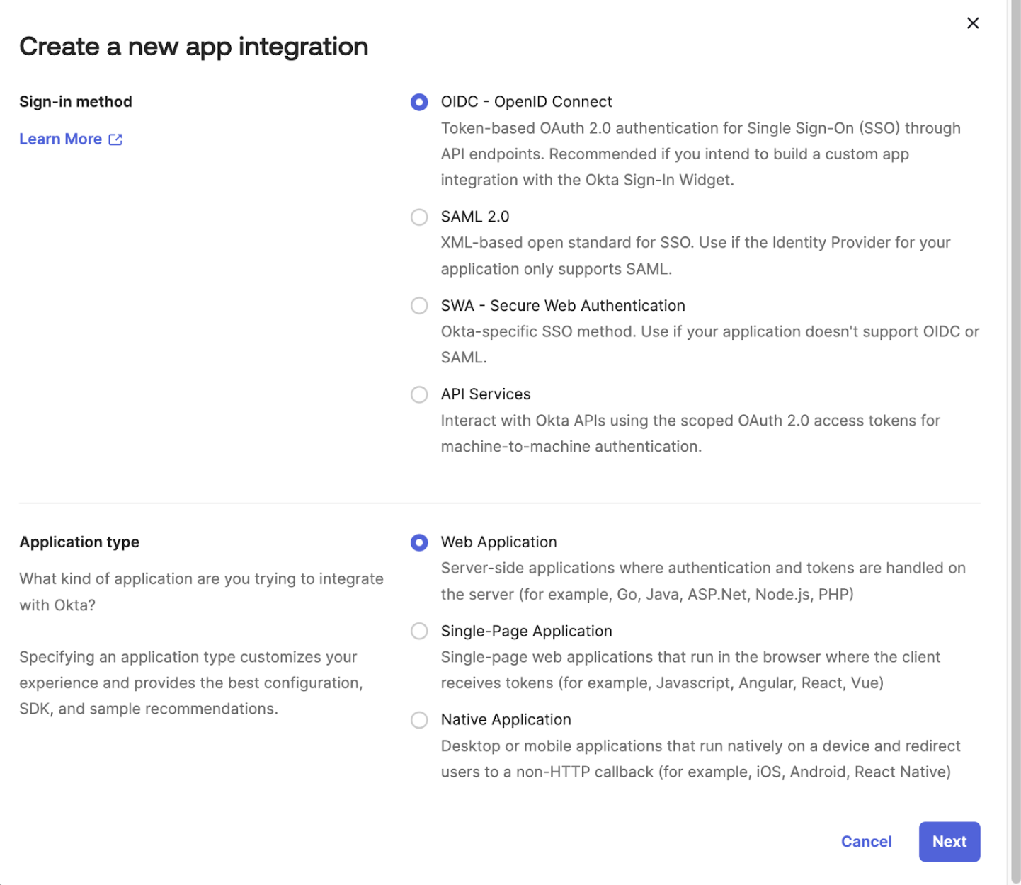 - Under Applications -> Applications -> click Create App Integration. Select OIDC and Web Application.